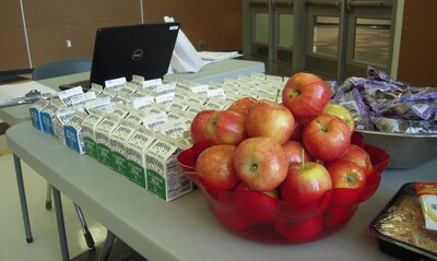 At other tables, most youngsters were tucking into the meals provided in the school lunch line – picnic pasta salad with veggies and whole grain goldfish crackers or pasta marinara with beans and carrots. Dessert was grapes or apples. The beverage was a choice of 1% or fat-free skim milk.