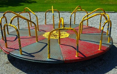 Half of me knew the merry-go-round was dangerous. I recalled stories from my childhood of kids flying off the edge at top speed or getting their heads stuck between the metal disk and the ground. But my kids LOVED it. Of all the hours we spent on it, we only had one bad experience – when my then 6-year-old son, who’d been lying on his tummy watching the ground blur by, suddenly flew off the side like a human lawn dart. Luckily, he landed in some actual grass.
