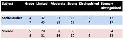 Girls did between 2 and 5 percentage points better in distinguished and strong in social studies and 1 point better at both grade levels of science.