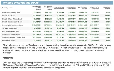 The proposed new formula for funding Colorado’s public colleges and universities would give every institution an increase in 2015-16, but some campuses would gain more than others.