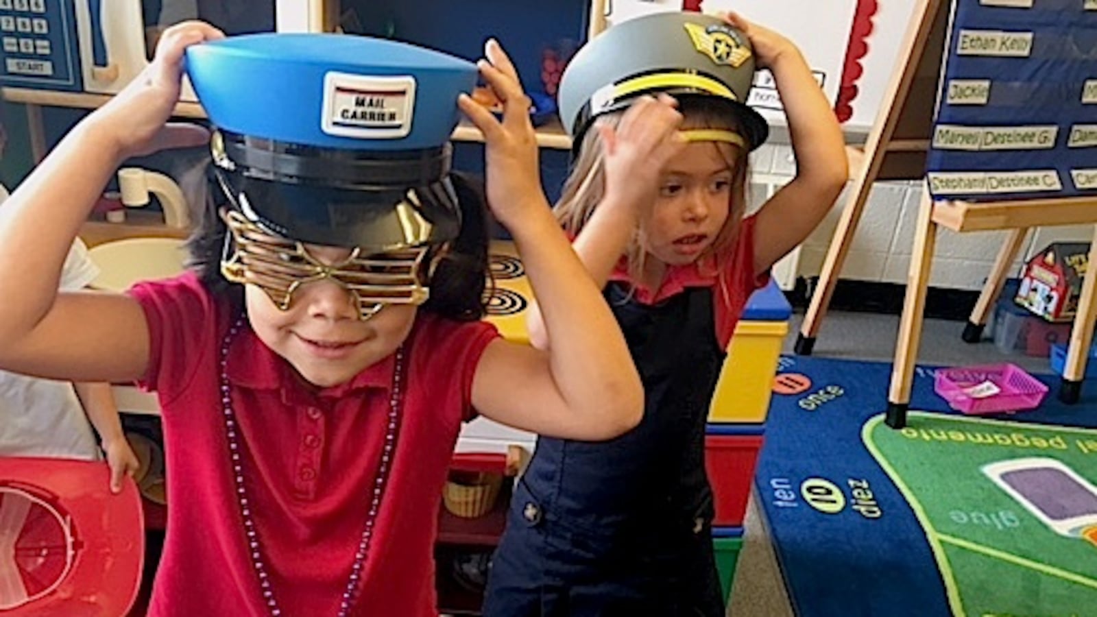 In one corner, children play dress-up with hats, goggles and necklaces. Across the room, three children chatter as they count colorful plastic bears.