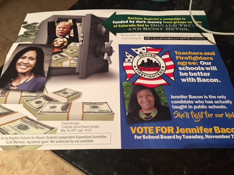 Most of Raising Colorado’s mailers have been in support of candidates, including several that have portrayed backers of the district’s agenda as strong voices fighting Trump and DeVos. Campaign finance reports show the group also paid for a mailer in opposition to Bacon.