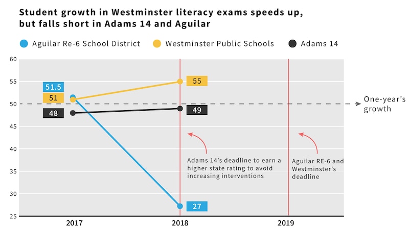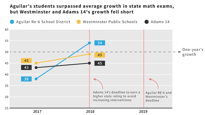 The school district of Westminster and the Aguilar school district, also on state-ordered improvement plans, have until 2019 to boost their state ratings.