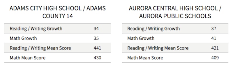 In the case of Adams 14, although growth scores rose in both math and English, the district failed to reach the average of 50.