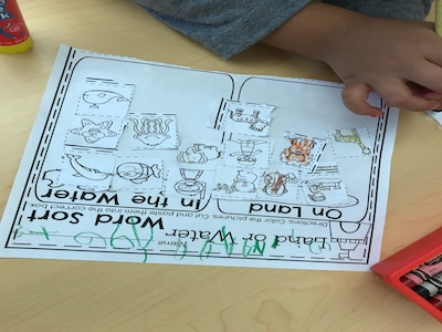 That trait was on full display on a recent morning in Mahoney’s class. As her 4-year-olds choppily maneuvered blunt-tipped scissors to cut out pictures of animals and paste them in the correct habitat — land or water — Mahoney multitasked, helping the students write their names in crayon at the top of their papers, checking to see if they washed their hands after going to the bathroom, and complimenting them when they shared the glue.
