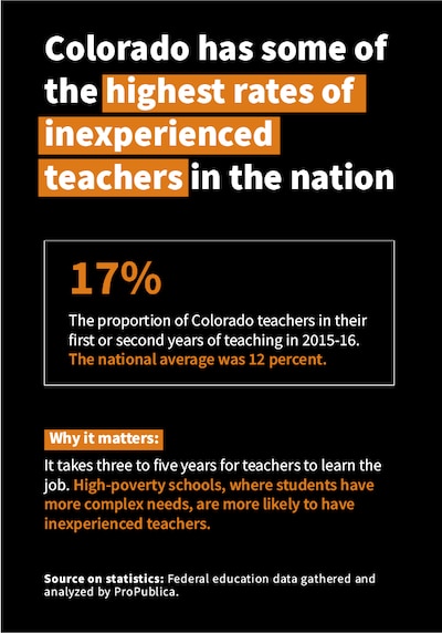 Chalkbeat reviewed more recent state data that follows the typical federal definition of “inexperienced teachers” — teachers with less than three full years of classroom experience — and found that the broad trends remain true and in many cases are even more severe than they appear in the federal data. Statewide, one in four Colorado teachers was classified as inexperienced. Last school year, 31 percent of Denver Public Schools teachers were in their first three years on the job, compared with just 7 percent of teachers in the more affluent Boulder Valley School District.