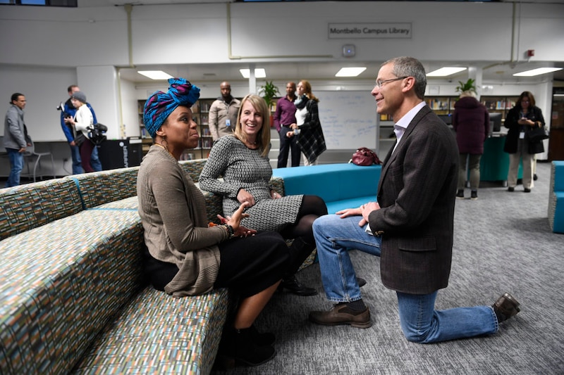 More than half an hour after leaving the elementary school for the Montbello campus, Boasberg walked into the new library around 6 p.m. There was comfy new furniture, $30,000 worth of new books, and five new flat-screen TVs that students in a book club organized by the new librarian used earlier that day to Skype with the author of a novel they’d just read.