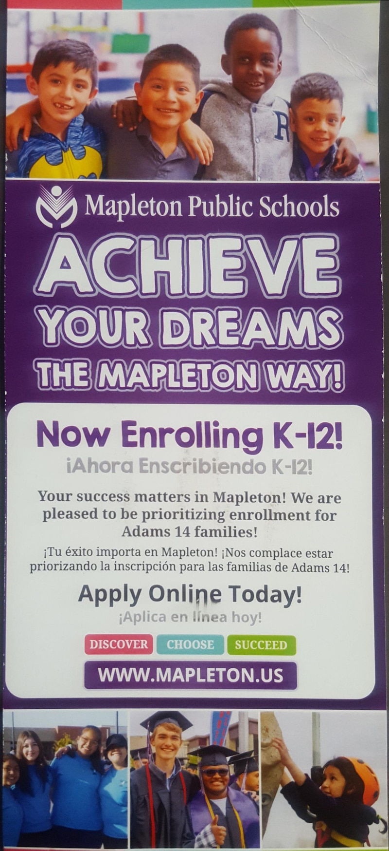 “Your success matters in Mapleton!” the mailer states. “We are pleased to be prioritizing enrollment for Adams 14 families!”