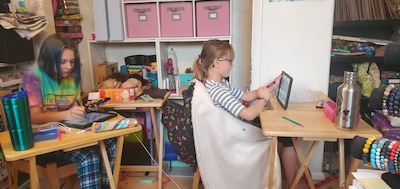 Tuesday the girls got to work by 9 a.m. They set up small desks in their mom’s home office and worked on their school-issued iPads. Babb, who is launching her own business, anticipated that she wouldn’t get much work done, and so spent the day making jewelry, between helping her daughters.