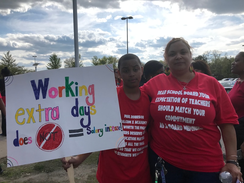 Many of the protesters were wearing red shirts and carrying signs that said things like “Rise up the wages for DPSCD educators.”