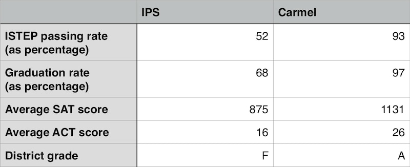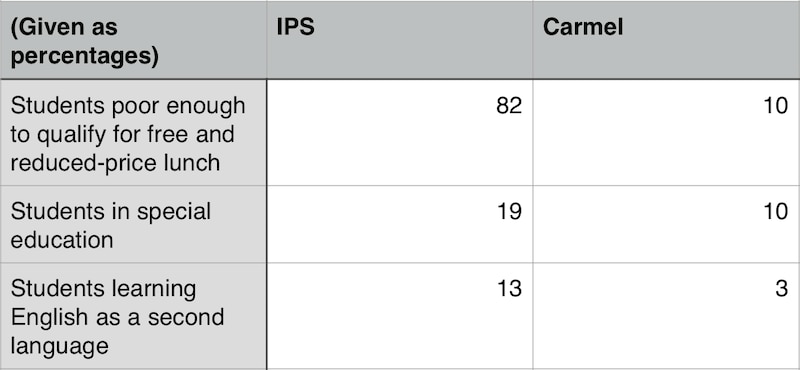 Carmel’s children appeared by these measures to be leaving the district among the best prepared students in the state. IPS students, by contrast, ranked among the worst in the state on these indicators.