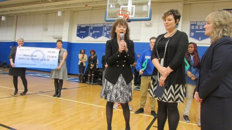 - Shortridge High School teacher Melody Coryell receives a giant check for $25,000 as a Milken Award winner.
