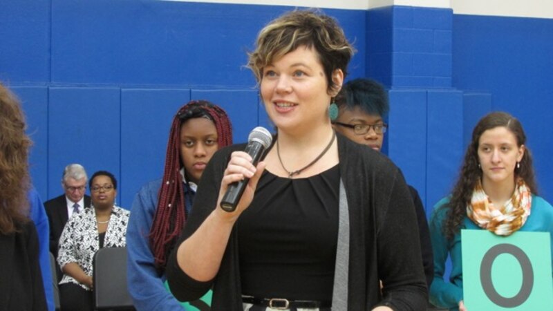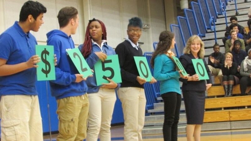 Shortridge High School students spell out $25,000, the prize that goes with the Milken Award, with help from Indiana State Superintendent Glenda Ritz.