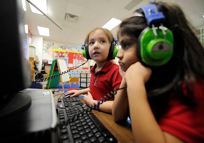 Kindergarteners use computers at IPS School 90. (Alan Petersime)