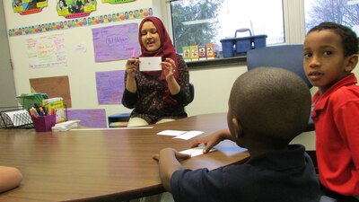 Immigrant students just arrived in the U.S. work on learning English words. (Scott Elliott)