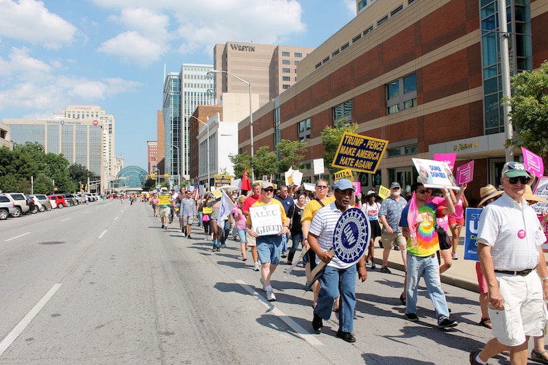 Dozens of educators from across the state today joined a protest of the annual meeting of the American Legislative Exchange Council despite blistering July heat.