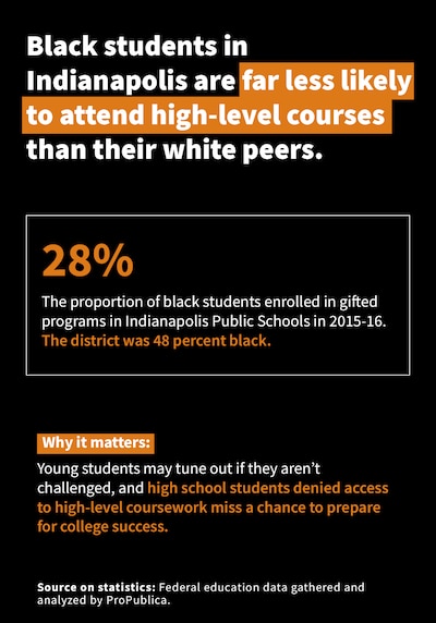 In Indiana elementary and middle schools, white students are three times as likely as black students to be enrolled in gifted programs, state data from 2016-17 show. In high school, white students are twice as likely as black students to be enrolled in Advanced Placement classes, according to federal education data, newly compiled by the nonprofit investigative news organization ProPublica in an interactive database.