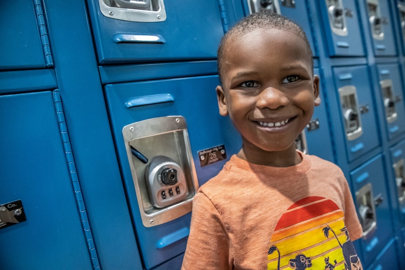 Morghan Hampton, 4, a pre-kindergarten student at Avondale Meadows YMCA Early Learning Center, smiles next to a set of lockers on Tuesday, April 30, 2019. (Mykal McEldowney/IndyStar)