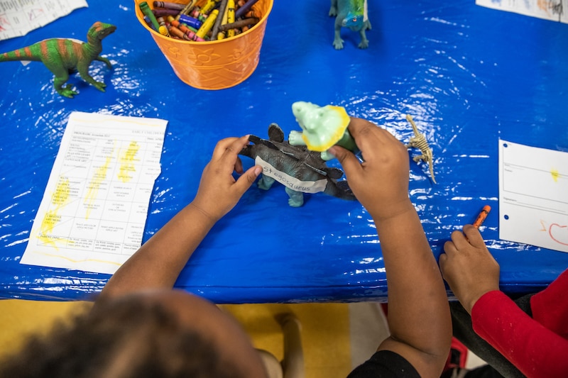 A child plays with two dinosaurs during a lesson at the Avondale Meadows YMCA Early Learning Center. (Mykal McEldowney/IndyStar)