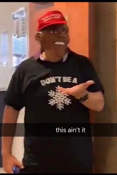 A white physical education teacher wore a mask of Barack Obama, a red “Make America Great Again” hat like those worn by President Trump and his supporters, and a black T-shirt with the words, “Don’t Be A” over an illustration of a snowflake. “Snowflake” is a term often used by conservatives to taunt people deemed overly sensitive.