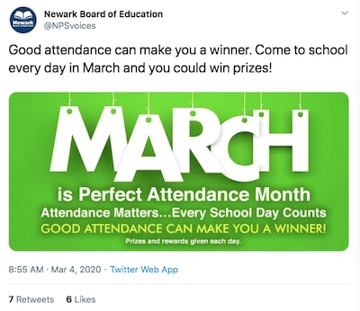 Yet the district has continued to promote March as “perfect attendance month,” as schools promise pizza parties and Amazon gift cards as rewards for perfect attendance. “Good attendance can make you a winner!” a notice on the district website said. On Wednesday, the notice was taken down.