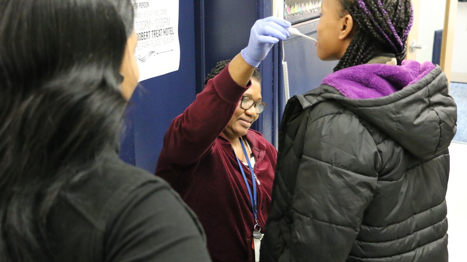 At Great Oaks Legacy Charter School’s campus in the South Ward, a nurse took Maria Williams’ temperature — along with all other visitors’ — before she entered to collect work packets and grab-and-go lunches for her children.