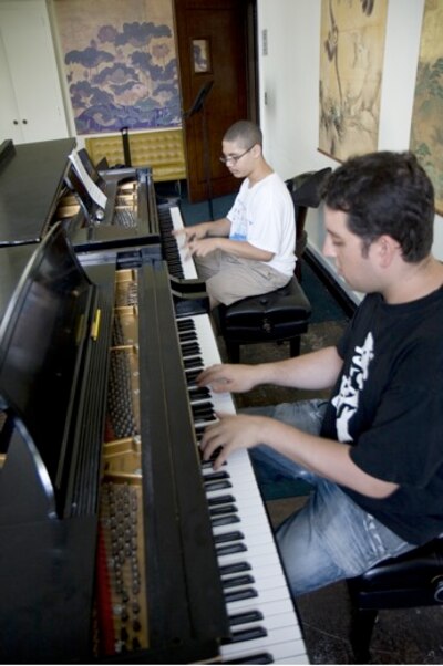This seriousness about the arts is shared by other students at the camp. Raldy Vargas, an advanced piano student and rising 9th grader at Christopher Columbus High School, is noted at the camp for showing up to his audition carrying a keyboard, just in case the school didn’t provide one. During his weekly one-on-one piano lesson, he works on jazz standard “Take the A Train” with teacher Karim Merchant. Merchant pushes him to strive for more accuracy in his playing, modeling how to practice the fingering for short phrases. Later, when Merchant asks what he’d like to work on, Vargas says, “There’s a song on YouTube I want to learn, it’s technically not jazz but….” He begins playing snatches of the piece. Vargas says that he trained himself to transcribe music that he hears.