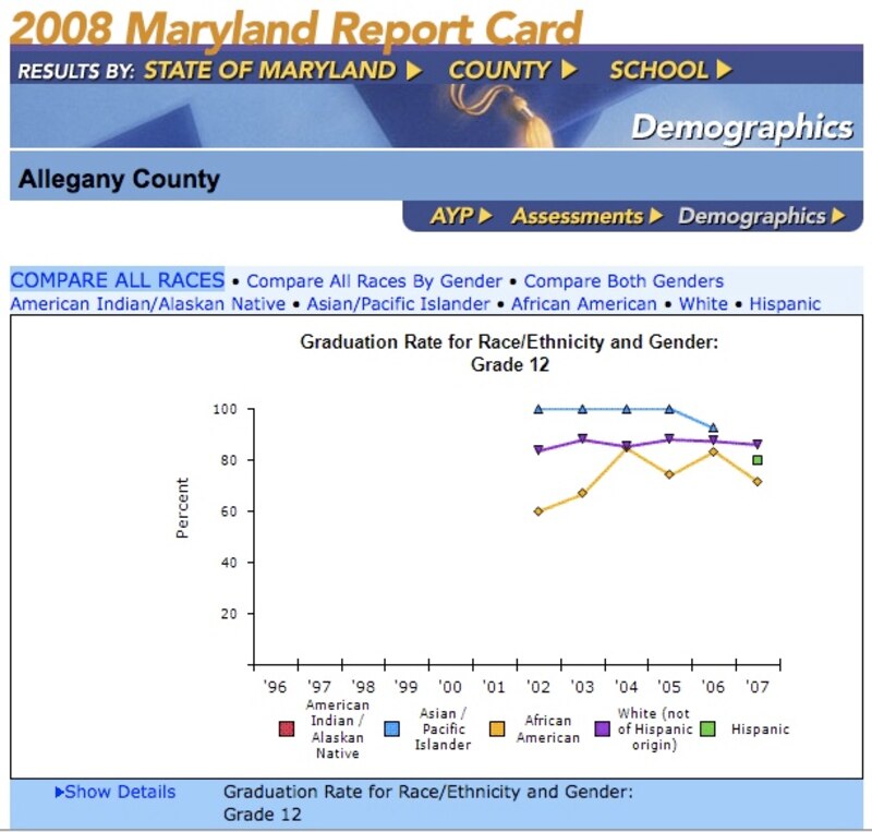 First stop, Baltimore. Maryland School Assessment test results – proficiency levels only – are available in a giant PDF report. But the state DOE saves the day with a data navigator that lets you check off groups you’re interested in and view graphs of proficiency data based on your choices. Two screenshots should give you a sense of the range of data available here.