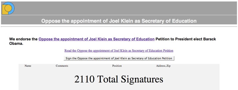 An online petition opposing Klein as Secretary of Education has collected more than 2,000 signatures since it was created Monday by a California education professor, Duane Campbell. The petition has attracted attention from dozens of Web sites, including those of Gotham Gazette and the progressive Nation magazine.