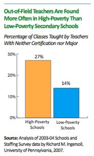 The problem is even worse in schools with a high percentage of poor students, where more than a quarter of classes may be taught by an “out-of-field” teacher. Middle school classes and math classes are also more likely to be taught by less-expert teachers, the report says.