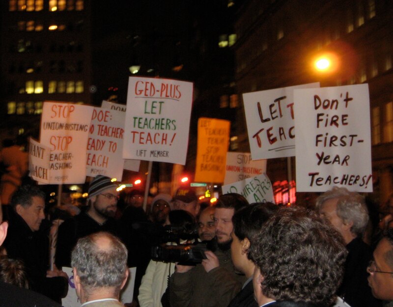 A few hundred teachers and union leaders rallied outside Department of Education headquarters last night to urge the DOE to fully implement a recent agreement creating incentives for principals to hire teachers who lost their jobs when their schools closed or were phased out.