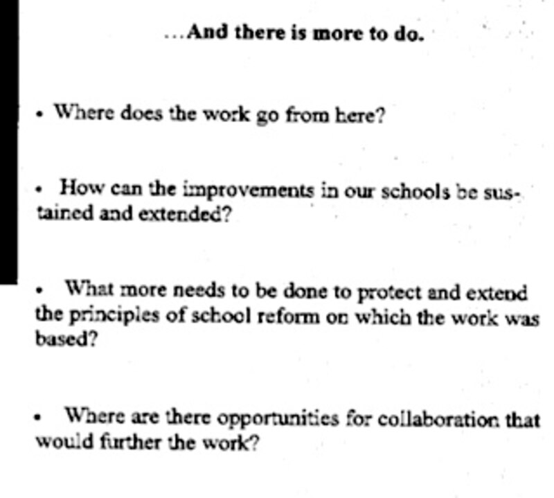 An invitation had promised discussion of “The Future of Our Work,” including a run-down of the successes and challenges of the Bloomberg administration’s school efforts. Successes included the fast expansion of small and charter schools, which the invitation concluded are out-performing traditional district schools and the reorganization of the school system with “schools at the center.” Challenges included the financial “sustainability” of partner groups that assist the schools; the requirement of sharing facilities with traditional public schools; and “Human Capital development.”