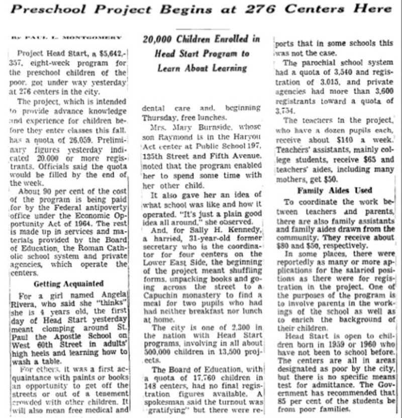 More than 20,000 youngsters participated in the first Head Start programs in New York City in the summer of 1965, the Times reported that year. The full article is after the jump.