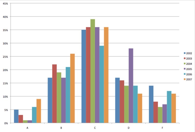 A B C D F 2002 5% 17% 35% 17% 14% 2003 3% 22% 36% 16% 8% 2004 1% 19% 39% 14% 6% 2005 1% 17% 36% 28% 7% 2006 6% 21% 29% 14% 12% 2007 9% 26% 36% 11% 11%