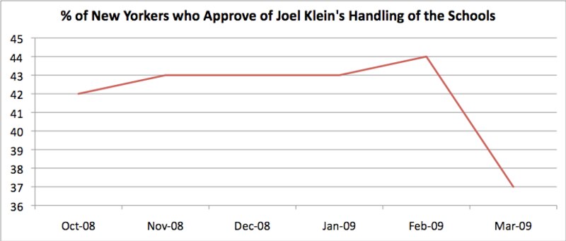 After a month packed with contentious public hearings about Klein’s tenure as chancellor, his approval rating dropped 7 points, to 37 percent, according to a new poll out of Quinnipiac University. His approval rating is lowest among blacks, Hispanics, residents of the Bronx, and women. It’s also just four points higher than his all-time low, posted two years ago just after mid-year school bus route changes frustrated parents citywide.