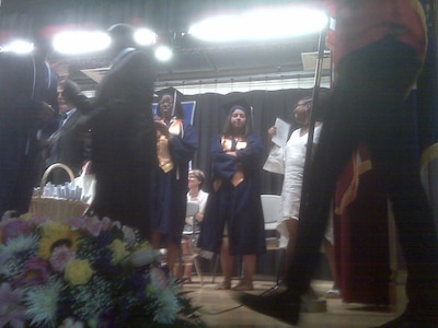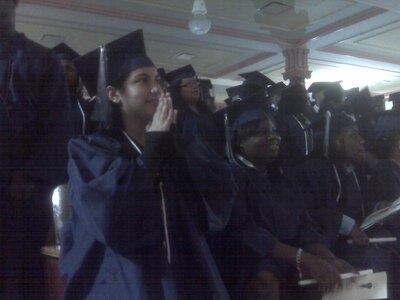 One of Cuthbert’s favorite reforms is what he described as a $12 million project to renovate a basement auditorium that had become a dump. The school’s custodian filled six full-sized dumpsters with its contents during the process, Cuthbert told me. The auditorium, now complete with floor-to-ceiling columns painted pink, comfortable fold-down chairs, and a vast stage, was the site of today’s graduation ceremony. Staff pointed to it proudly, calling today special because it was the first graduation the school has seen with that auditorium.