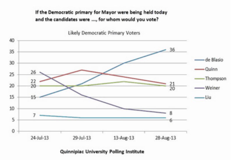 A new Quinnipiac poll has Public Advocate Bill de Blasio surging into the lead in the Democratic race for mayor. De Blasio would receive 36 percent of the primary vote, the poll found, with City Council Speaker Christine Quinn at 21 percent and Bill Thompson at 20 percent.