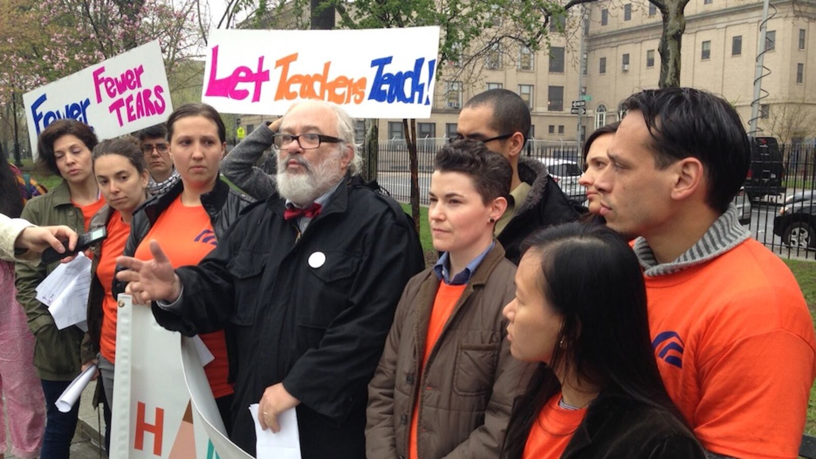 Standing in a park across the street from International High School at Prospect Heights, more than a dozen teachers held up signs and criticized the increased role that tests have played in their school. They argued that a city-created reading and writing test now being administered in city high schools was developed with little consideration for their students—most of whom recently moved to the United States and are still learning English.