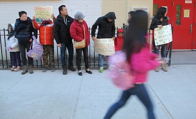Just then, as if some secret tardy bell had sounded, parents and children appeared and lined up along the metal fence outside the school. Teachers trickled out of the building and handed out signs scrawled in English and Chinese characters. Before long, the line stretched the length of the building.