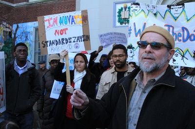 After school let out Thursday afternoon, about 100 City-As-School students and educators marched from their Manhattan high school to Washington Square Park chanting, “Hey hey, ho ho, Cuomo’s plan has got to go,” and “stakes are high, test scores lie.”
