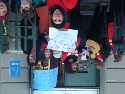 By 8 a.m., the block in front of the school was packed with parents, students, and teachers, many of whom had brought homemade signs. (One included Gov. Cuomo in a “Where’s Waldo” hat.) As parents gathered, Principal Laura Scott led a schoolwide singalong of “We Are the World” with new, anti-testing lyrics.