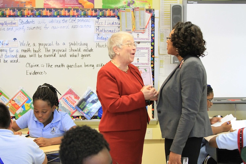 Chancellor Carmen Fariña speaks with Monique Campbell, the principal of The School of Integrated Learning, one of the city schools that will begin absorbing a struggling middle school next year. (Stephanie Snyder)
