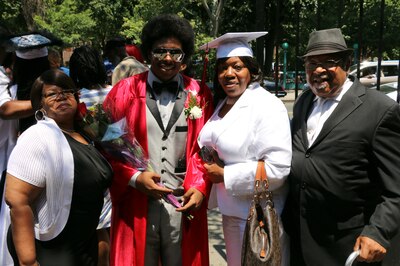 Off to the side, Tyjuan Felton, a class of 2016 graduate, chatted in his wheelchair with Keith Robinson, a 2013 graduate who had returned to work at the school last year as a paraprofessional supporting students with disabilities. Felton praised Robinson, who had showed up to watch his former student graduate.