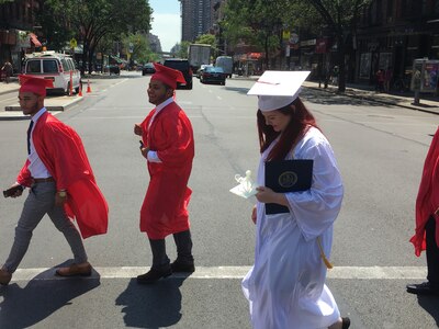 Still, last Friday, donning a white graduation gown and a grin, Duignan joined about 100 of her classmates in a celebratory march through Midtown and into the auditorium of New World Stages on 50th Street, where her parents looked on while she officially graduated from high school.