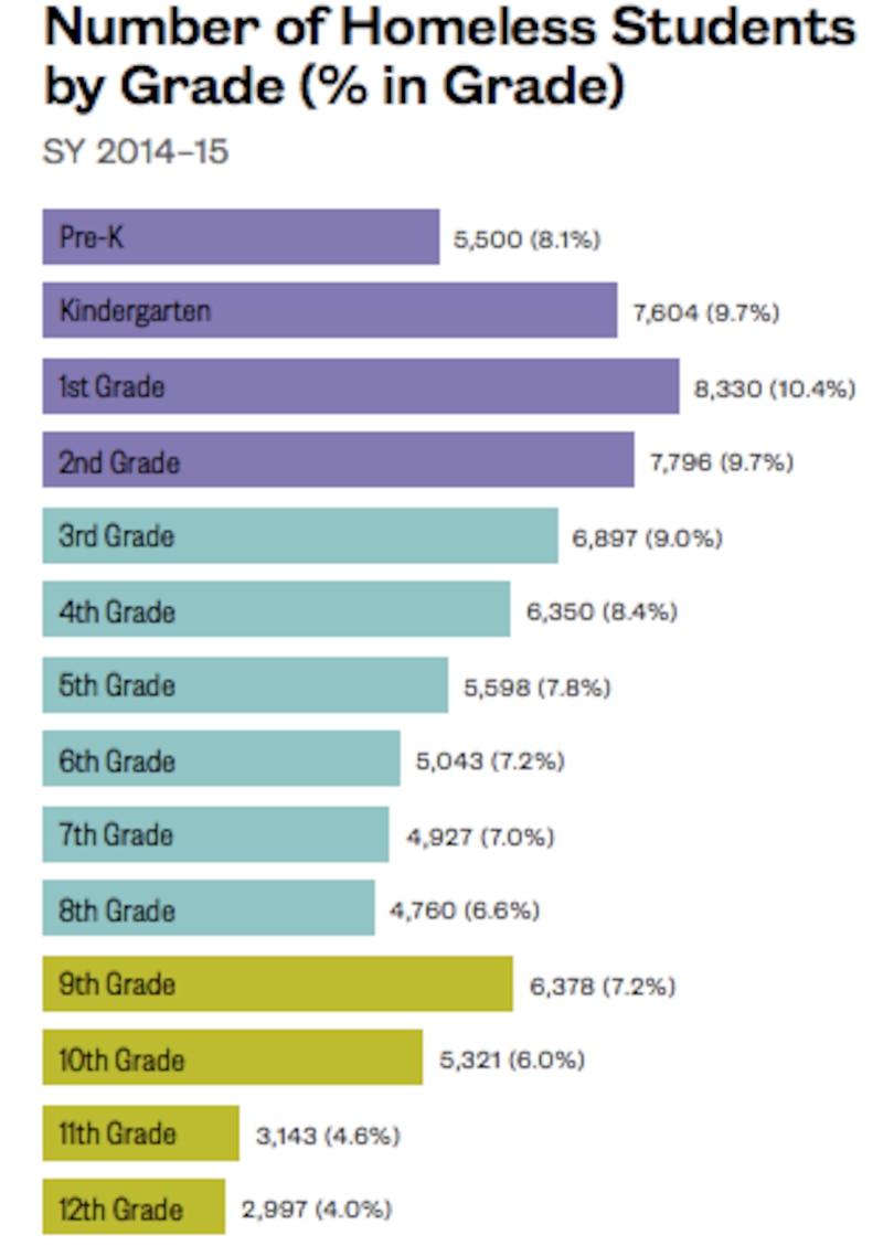 3. The city’s homeless students skew young. In the 2014-2015 school year, 38 percent of them were in pre-k through second grade.