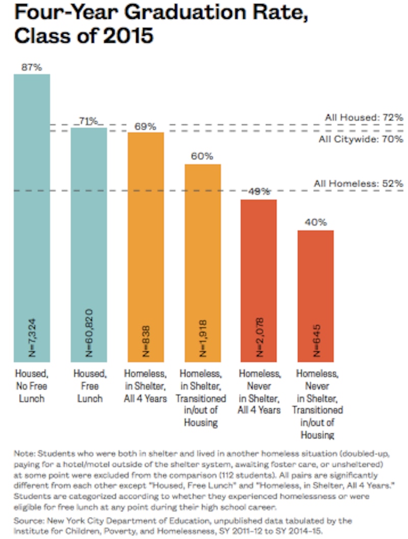 9. Still, there are bright spots. Those who live in shelters for all four years of high school graduate at similar rates as their low-income peers who are housed, a fact one of the report’s contributors said warrants further study.