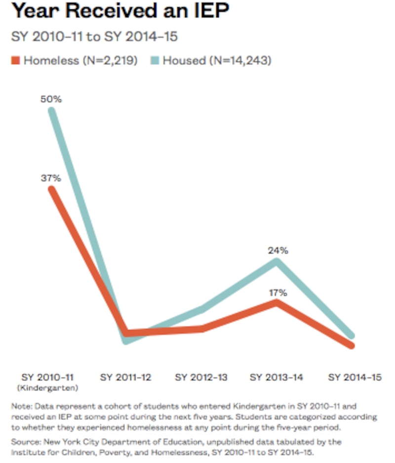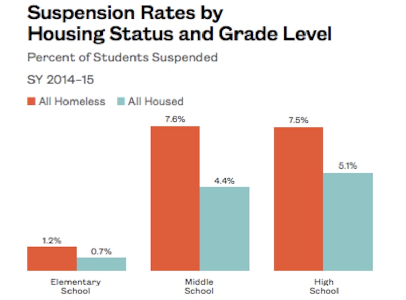 8. Just 37 percent of homeless students with an individual learning plan had their disability identified by the end of kindergarten, compared with 50 percent of their housed peers. That’s important because homeless students whose disabilities are identified early are much more likely to be on grade level, and less likely to be suspended.