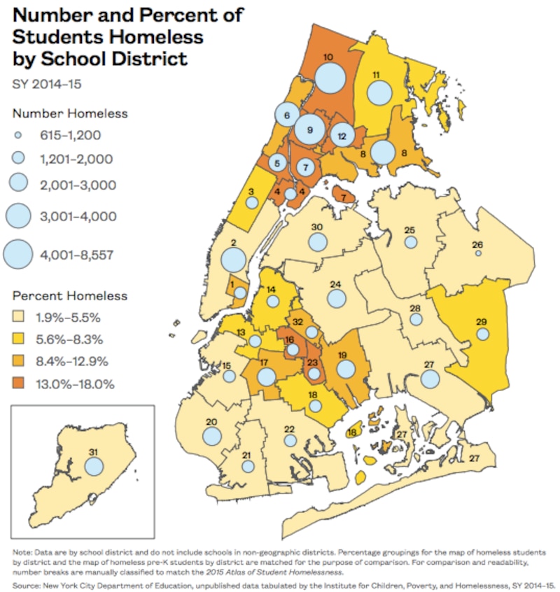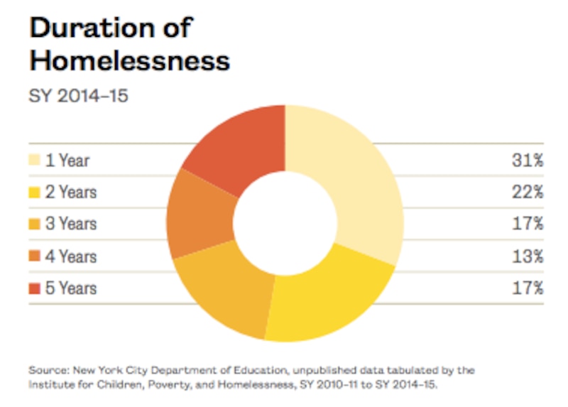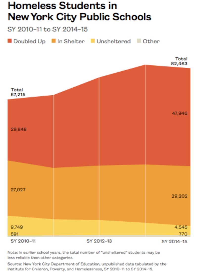 About 127,000 New York City public school students — or one in eight — have been homeless at some point in the last five school years, more than the total population of Boston and Seattle’s school systems combined. The effect of housing instability and poverty on those students is immense and is detailed in a report released Wednesday by the Institute for Children, Poverty, and Homelessness — a New York-based nonprofit.