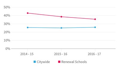Though the Renewal program has had mixed success raising test scores and graduation rates, the share of students who are chronically absent at those schools has fallen by just under 8 percentage points since 2015. (Still, the schools’ 36 percent chronic absenteeism rate is significantly higher than the 26 percent citywide rate.)