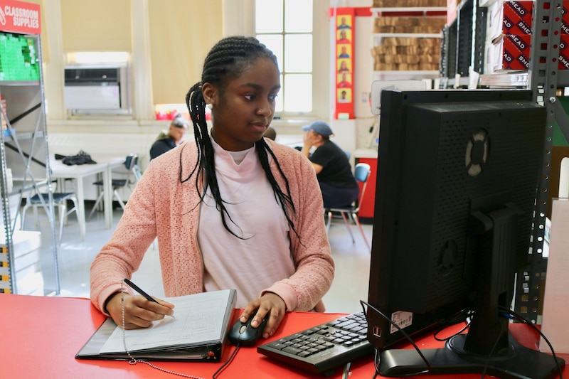 In another part of the building, students work at a mock Staples — dubbed “Paper Clips” — where they serve as a logistics center for the entire school. On a recent afternoon, 16-year-old Gabriella Logdell pored over a Google form that listed orders from teachers for items, such as copy paper, binders, or sanitizer. Later, students go through the process of finding the products, completing an invoice, and delivering the items directly to the teacher.